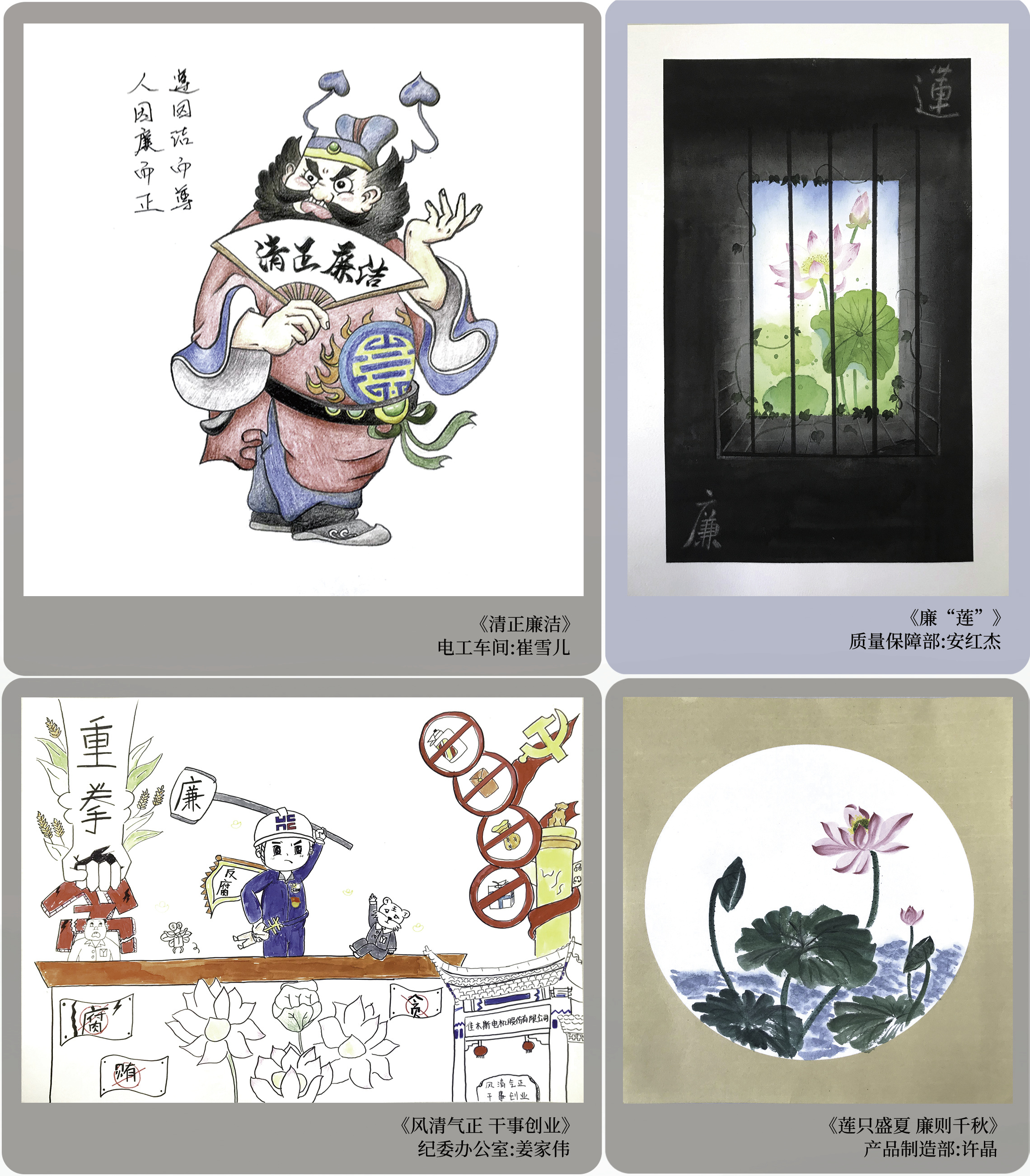 书画言志,金石寄情。作品中既有以寓意廉洁高尚的“莲”“竹”为元素的绘画和幽默风趣、构思巧妙的漫画,以廉政诗词、格言警句为内容的书法作品,也有惊艳夺目、精美细腻的五谷粘贴手工艺品,还有通过职工视角、别具一格的构思,演绎拍摄出佳电廉洁文化故事。通过这些作品实现了廉洁文化与书画艺术充分融合,增强了廉洁文化教育的吸引力、说服力、感染力和穿透力,展现了776net必赢官网广大党员干部职工防微杜渐、廉洁从业的信心和决心。
