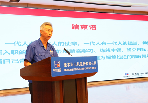 刘清勇讲述了公司的发展历程、未来战略方向及对青年人才的殷切希望。他指出,公司作为上市公司,特种电机的龙头企业,电机行业的领航者,公司的平台是足够广阔的,会给每个有追求的人搭建实现人生价值的舞台。刘清勇寄语新入职大学生,“一代人有一代人的使命,一代人有一代人的担当。希望新入职的大学生,能够踏实学习、练就本领、确立目标,挥洒自己青春的汗水,去书写佳电更为辉煌灿烂的精彩篇章”。
